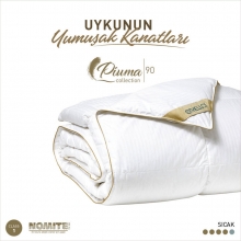 Piuma 90 Yorgan kaz tüyü yorganların en hacimli, havalı ve yumuşak olanıdır. 200 gr/m² %90 gıdık kaz tüyü içerir. Şık jakar desenli %100 pamuk tüy geçirmeyen kumaş ile kaplıdır.  5 üzerinden 4 ısıtma derecesine sahip sıcak bir üründür.  Kış aylarında kalın yorganların altında ezilmeden, terlemeden sıcacık uyumanızı sağlayacak konfordadır.  . Kumaşı Nomite özellikli, tüy geçirmeyen , jakar desenli %100 pamuktur. Nomite sertifikası, toz akarı ve ev tozu alerjisi olan kişiler icin uygun olduğunu garantilemektedir.