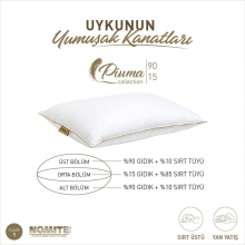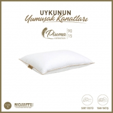 Piuma 90/15 yastık koleksiyonun en çok tercih edilen yastığıdır. 3 odalı – 3 katmanlı  özel tasarım bir yastıktır. Alt ve üst odalarda %90 gıdık kaz tüyü içermektedir. İç odada ise %15 gıdık kaz tüyü bulunmaktadır. İç odadaki %15 gıdık kaz tüyü (%85 sırt kaz tüyü) yastığa dolgunluk ve yükseklik verir. Dış odalardaki %90 gıdık kaz tüyü ise başınızı yumuşacık bir yastığa koymanızı sağlar. Böylece yan ve sırt üstü yatanlara uygun ymuşak ve yüksek yastık oluşur. Kumaşı Nomite özellikli, tüy geçirmeyen %100 pamuktur. Nomite sertifikası, toz akarı ve ev tozu alerjisi olan kişiler icin uygun olduğunu garantilemektedir.