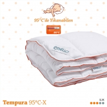 Yorganımız Thermolite 95°C elyaf dolguludur. 5 üzerinden 3 ısıtma derecesine sahip ılık bir üründür. Dolgun, yumuşak ve yüksek ısıda yıkamaya dayanıklıdır. Tempura 95°C-X  yorganın  dış kumaşı  yüksek derecede yıkamaya dayanıklı mikro kumaştır.