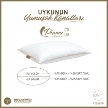 Piuma 70/30 yastık koleksiyona yeni eklenmiş ürünümüzdür. 2 odalı – 2 katmanlı  özel tasarım bir yastıktır. Alt odada %70 gıdık kaz tüyü alt odada %30 kaz tüyü bulunur. Yüzüstü yatanlara özel alçak bir yastıktır. Yastığa başının gömülmesini sevenler %70 gıdık yüzü kullanabilir. Kumaşı Nomite özellikli, tüy geçirmeyen %100 pamuktur. Nomite sertifikası, toz akarı ve ev tozu alerjisi olan kişiler icin uygun olduğunu garantilemektedir.